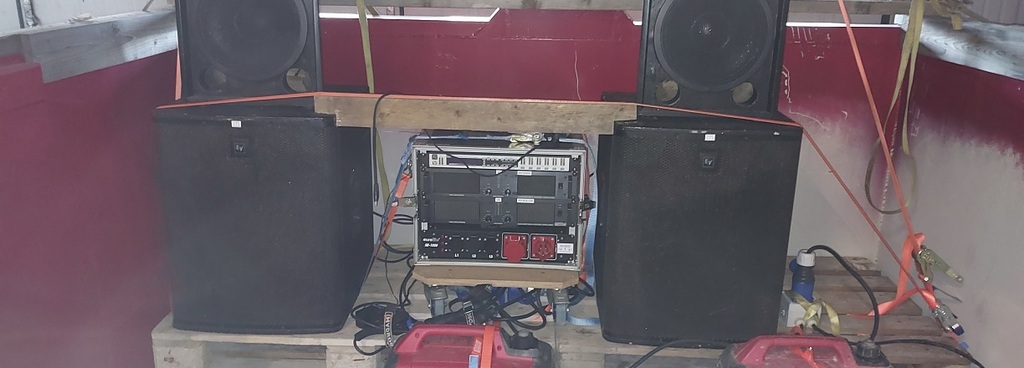 2 st. Electro-Voice passiva topphögtalare ZX5 och 4 st. Elctro-Voice passiva sub-basar ELX118. Slutstegscase med Lab slutsteg 2000C/4000 med delningsfilter/processor och ett litet mixerbord.