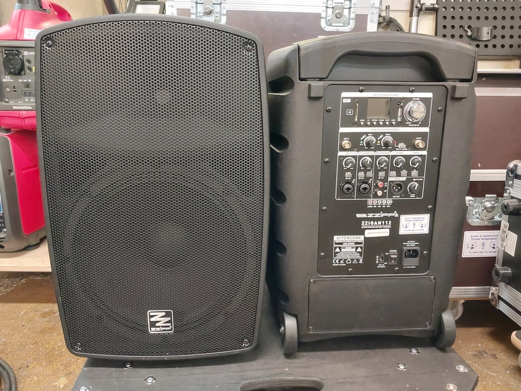 Liten portabel ljudanläggning som går både på batteri och 230 Volt.