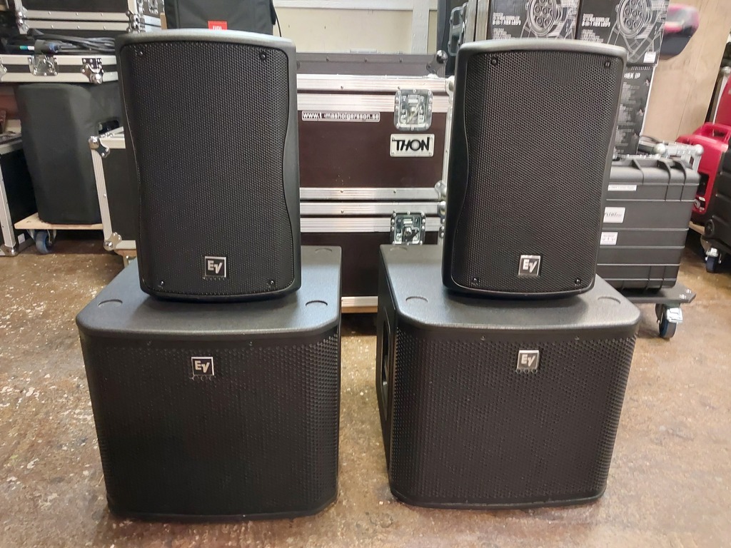 2 st. Electro-Voice aktiva topphögtalare ZXA1 och 2 st. Electro-Voice sub-basar ZXA1-Sub. Litet mixerbord att ansluta spelkälla typ mobiltelefon.