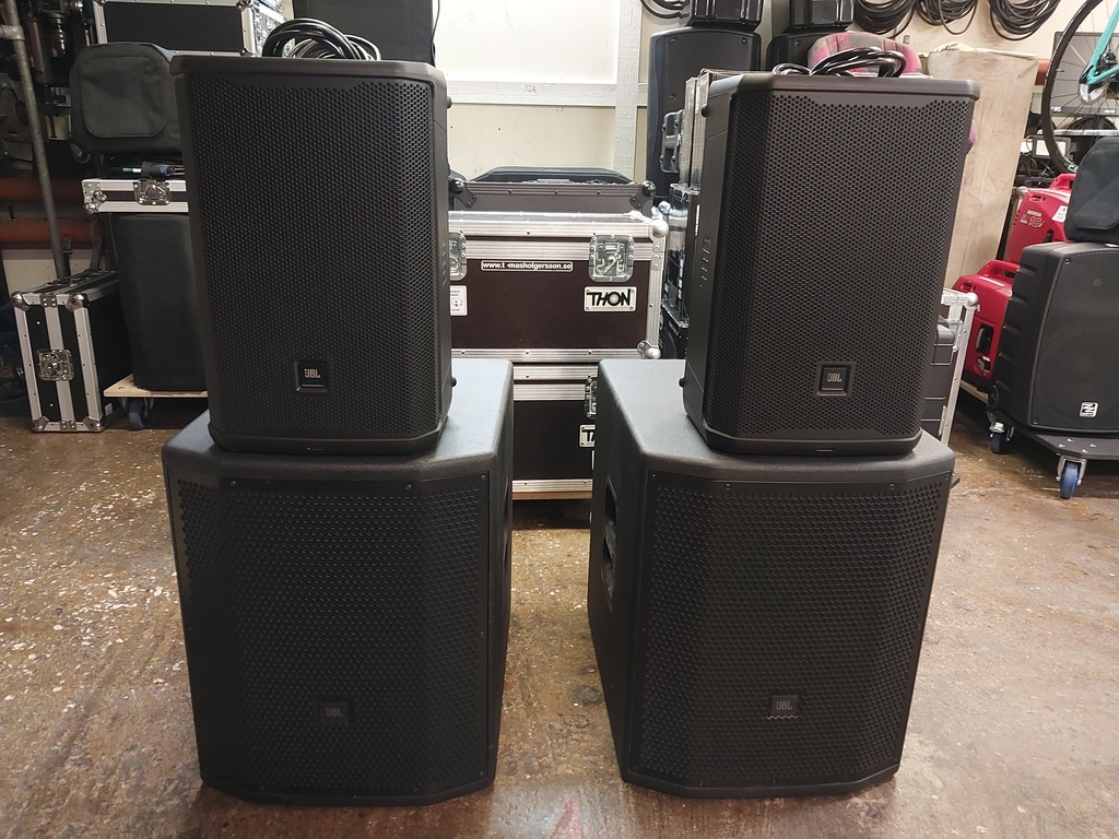 2 st. JBL aktiva topphögtalare PRX908 och 2 st. JBL sub-basar PRX815XLFW. Litet mixerbord att ansluta ljudkälla typ mobiltelefon.