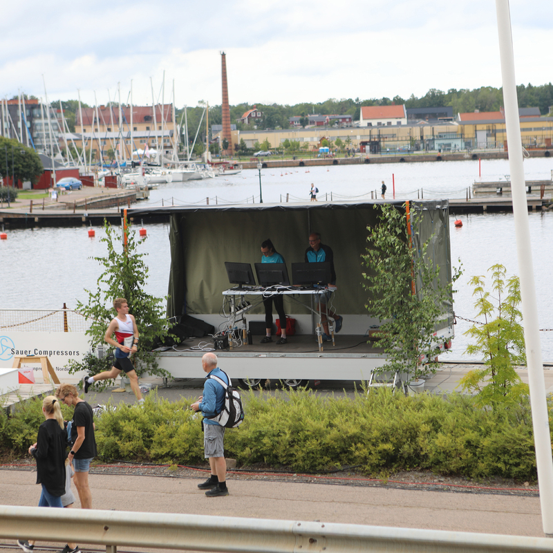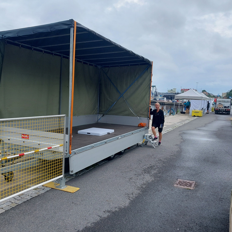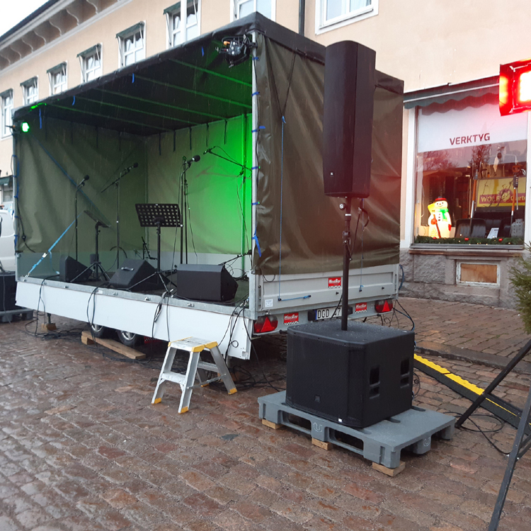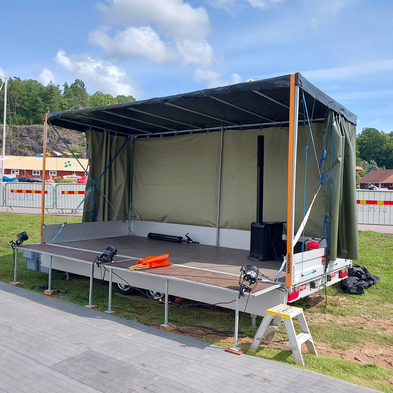 Den här scenen är väldigt behändig och lätthanterlig vilket gör den passande till alla möjliga mindre event där det behövs en talarplats eller en scen för uppträdande. Man kommer nära publiken eftersom den inte är så hög. När alla tre väggar används har man skydd från väder och sol. Man väljer själv hur öppet man vill ha det. Vi levererar och sätter upp enligt dina önskemål.